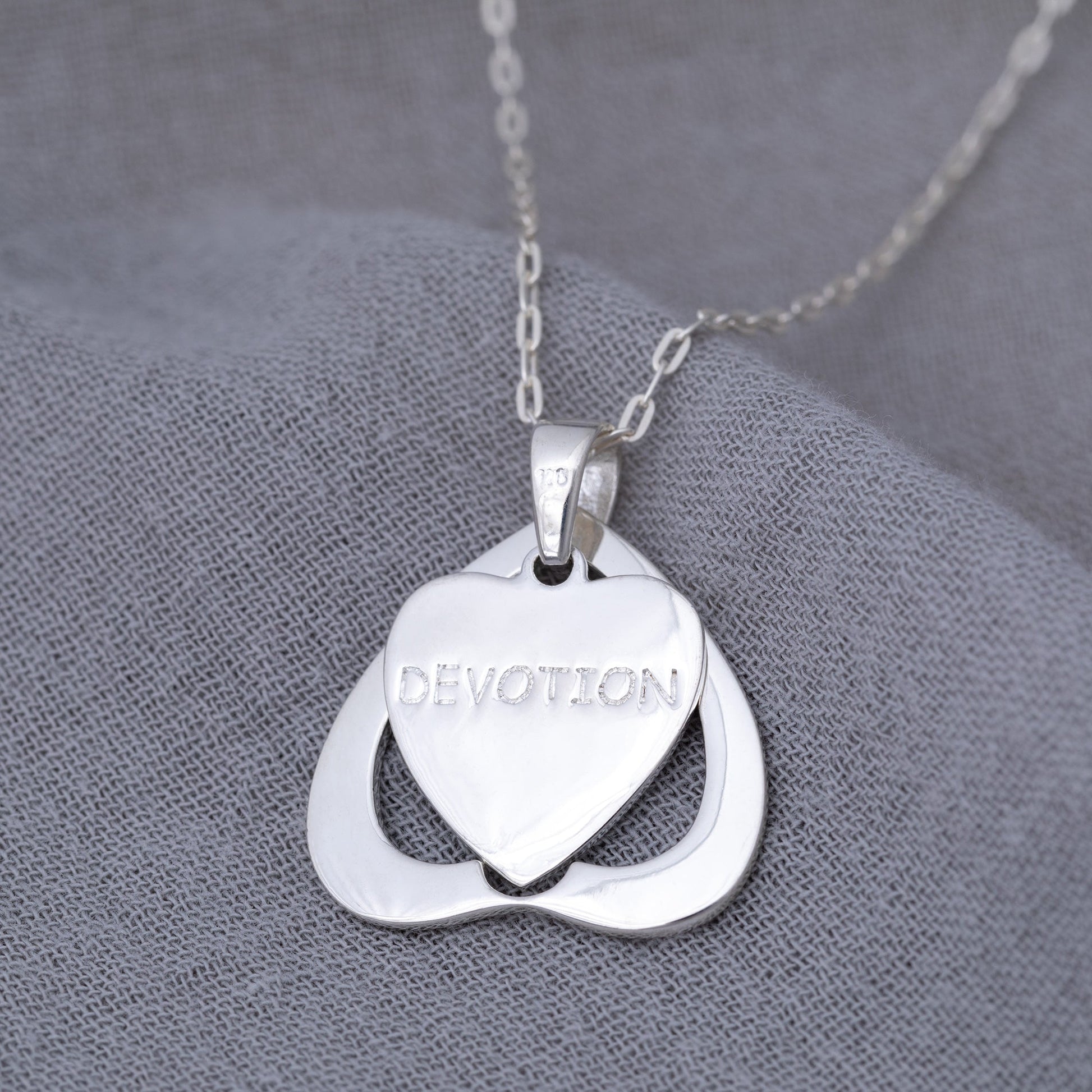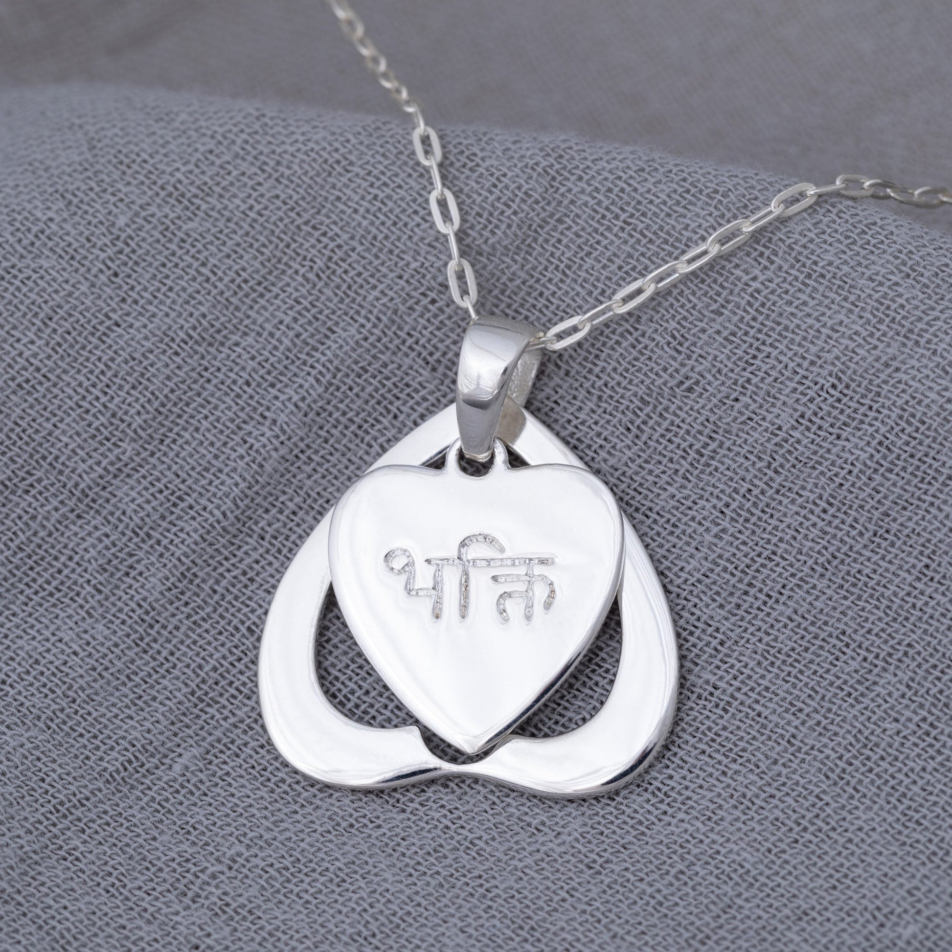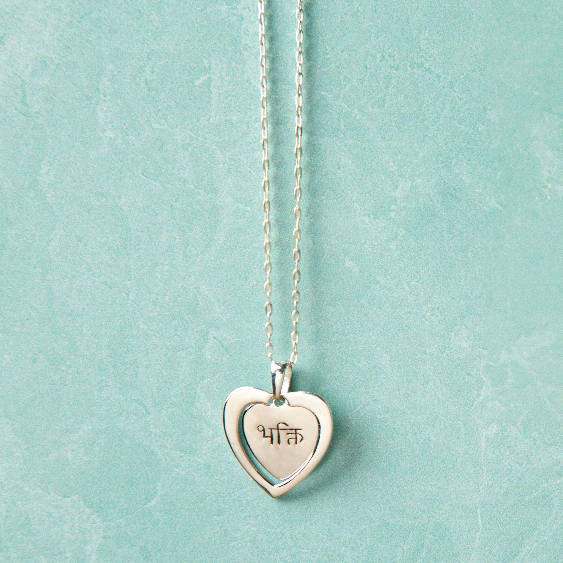 With a lovely heart within a heart design, the central piece is engraved with "Devotion" on one side, and the other side reads Bhakti, meaning the same in Sanskrit.