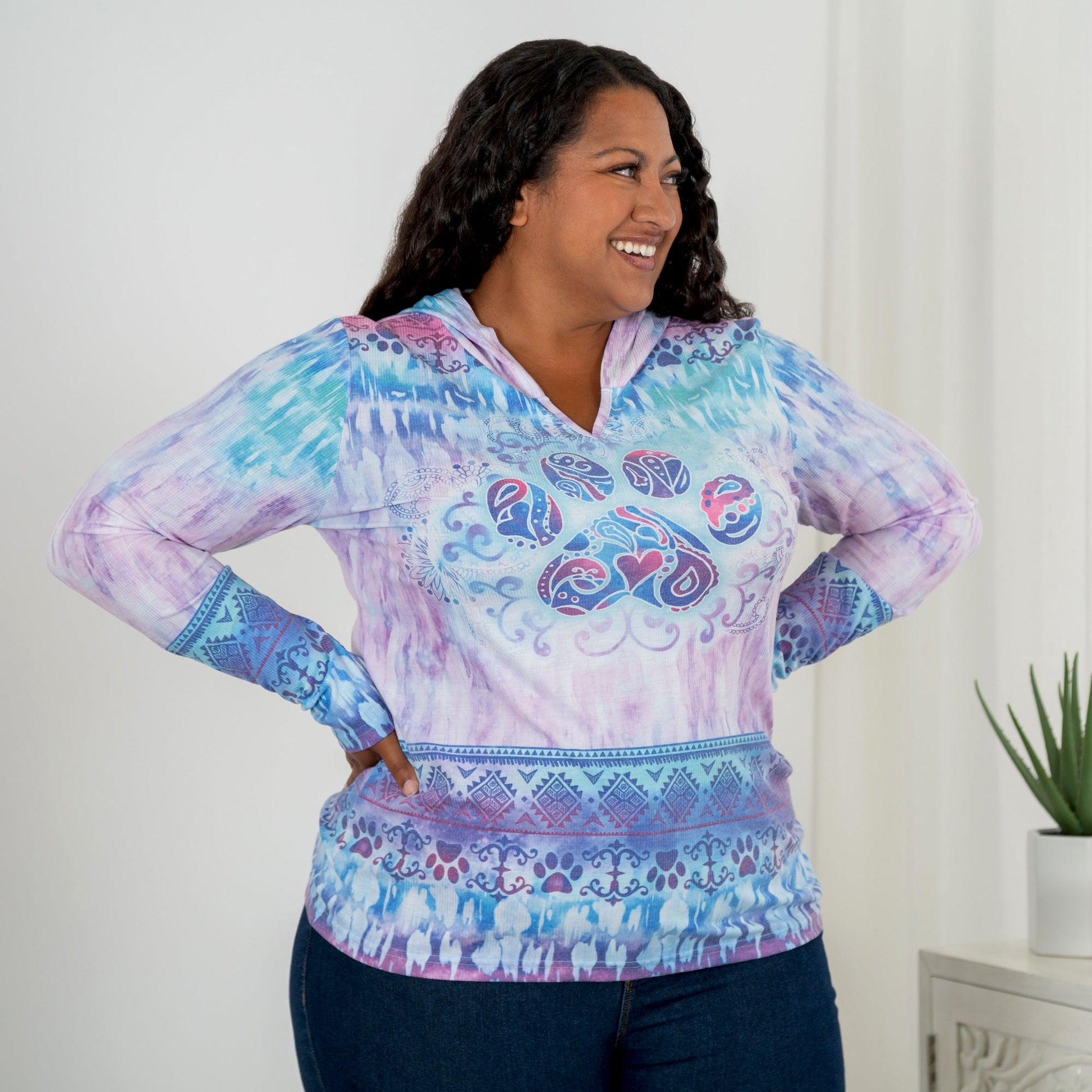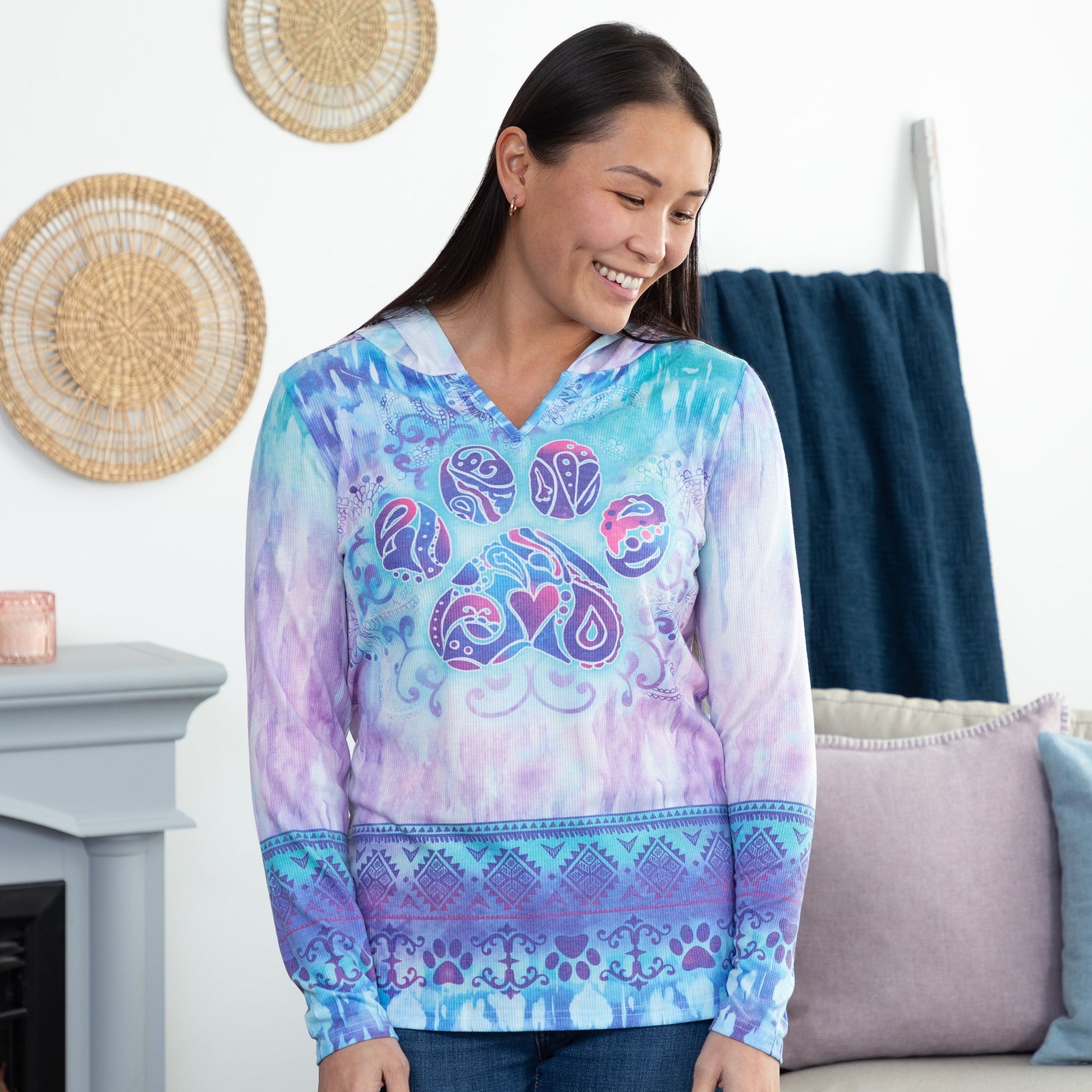 Vivid, animal-loving design meets cozy comfort in this Animal Rescue Site exclusive. The slightly stretchy, oh-so-soft fabric is ribbed to keep warmer, while also being lightweight and thin enough to provide layering opportunities. Watercolor dreaminess in blue, purple, pink, and green abounds in the cosmic design centered around our unique, arty paw print motif formed by hearts and paisleys. Curlicues, paws, and southwestern vibes create stripes finishing off the look, topped with a hood to match the warmth of the colorful design.