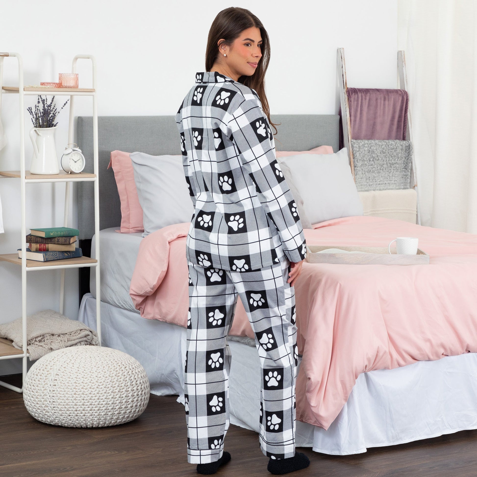 A cozy slumber overtakes you when you slip into this soft, brushed flannel pajama set! Made with a timeless design, this button-up top and drawstring-waisted pants are printed in paws on plaid -- ensuring your dreams are filled with the faces of your beloved furry friends! Topped with satin piping along the sleeves and bottom hems, and all along the front and collar for a polished finish.