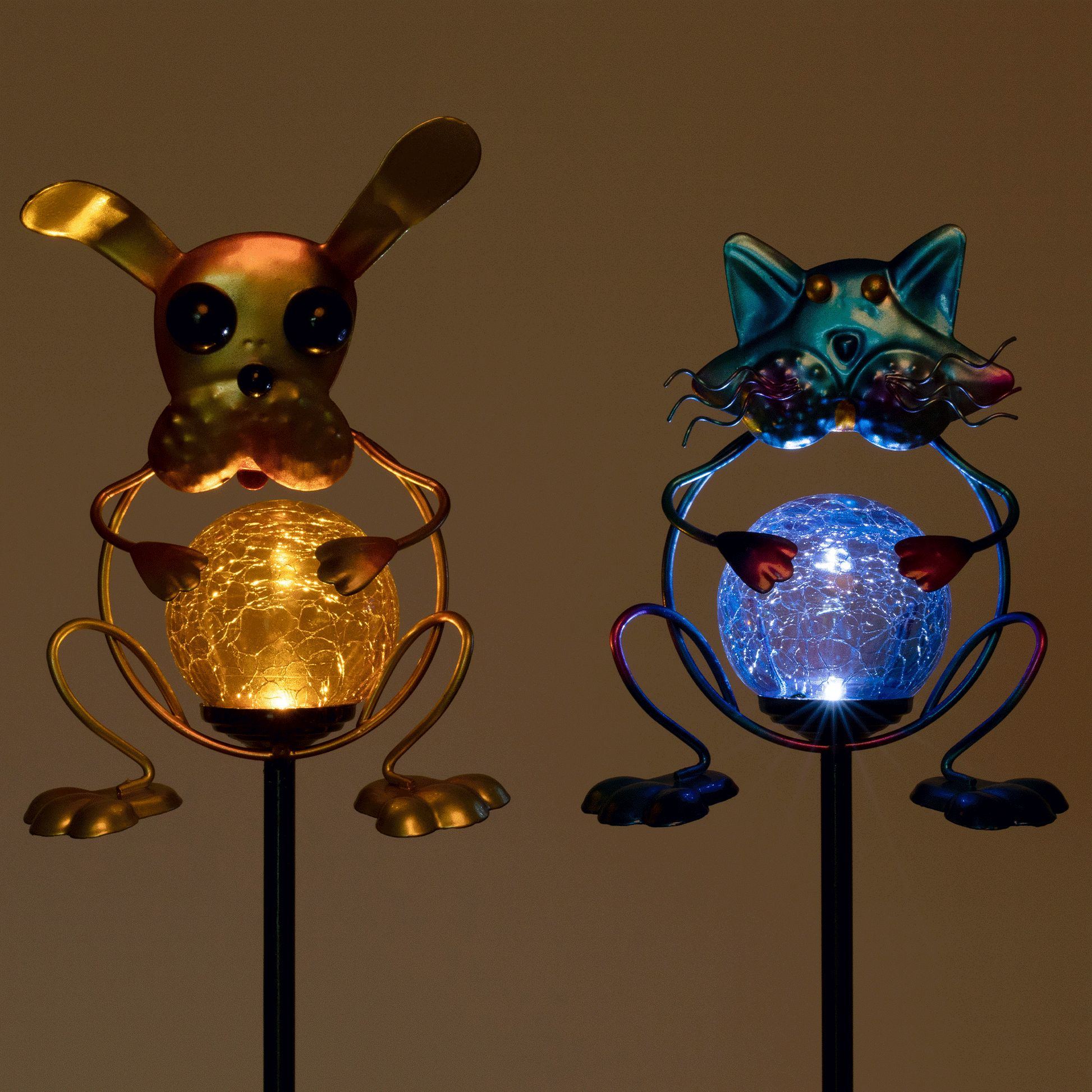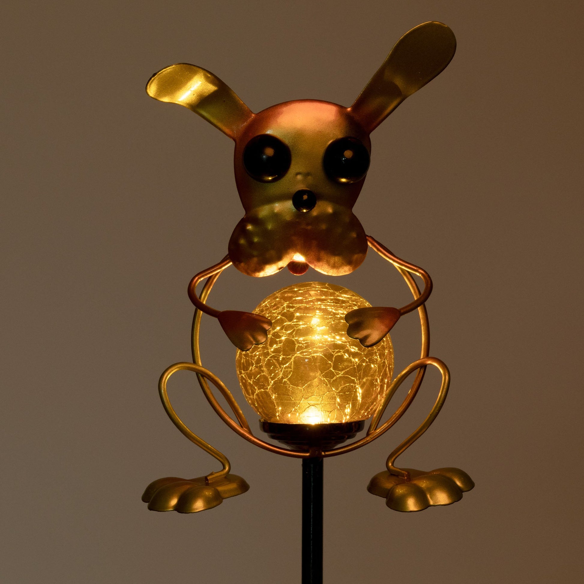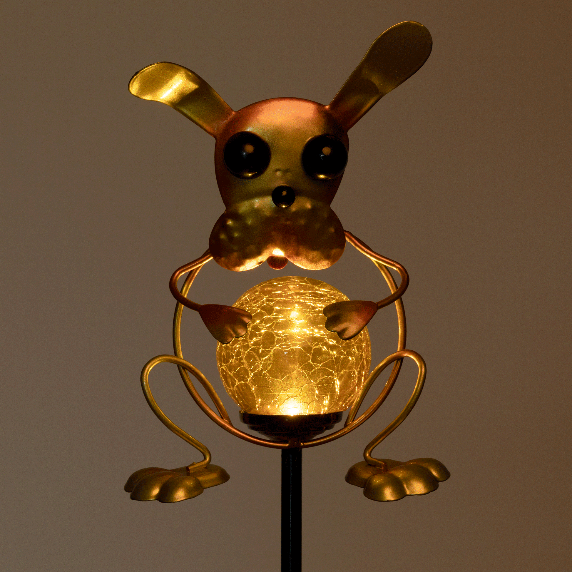 Your perky-eared pet lights up your life, and now this colorful critter lights up your yard and garden too! Easy to assemble and plant firmly in the ground, simply adjust the solar panel and flip the switch underneath to prepare this light to emit a soft, dreamy glow. Made with a colorful metal pet silhouette, and a solar light within the bulb which shines softly in the dark.