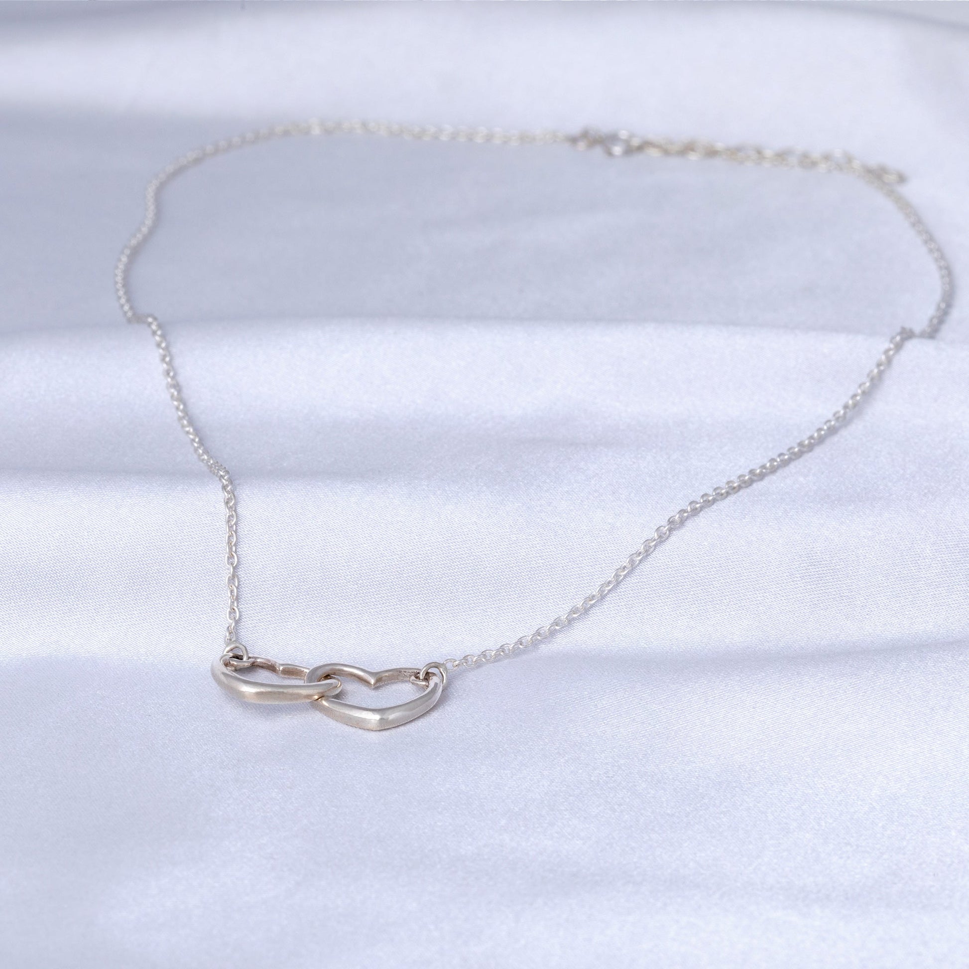Two sterling silver hearts are linked together in this sweet silver accessory -- symbolizing two hearts beating as one! A simple design with a heart-filled message.