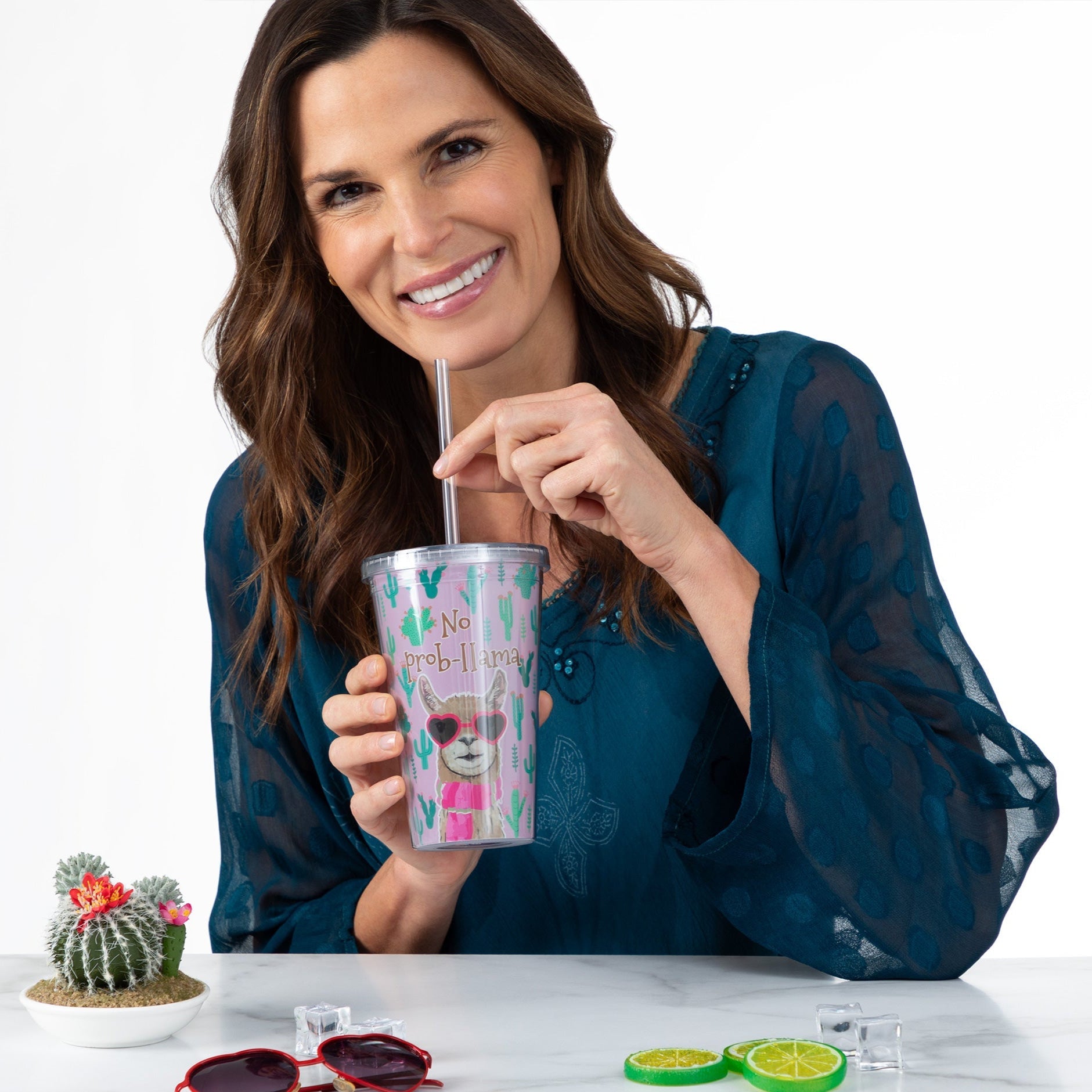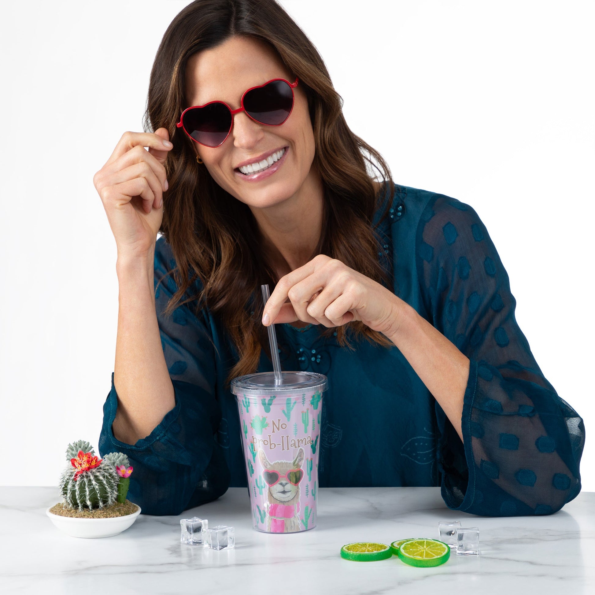 Stylish in pink heart sunglasses and a scarf, this lovely llama exudes an effortlessly cool vibe along with the phrase "No prob-llama." Featuring a cheery pink background covered in cacti on the double layer walls, this eco-friendly BPA-free cup and straw helps you stay hydrated in laid back style.