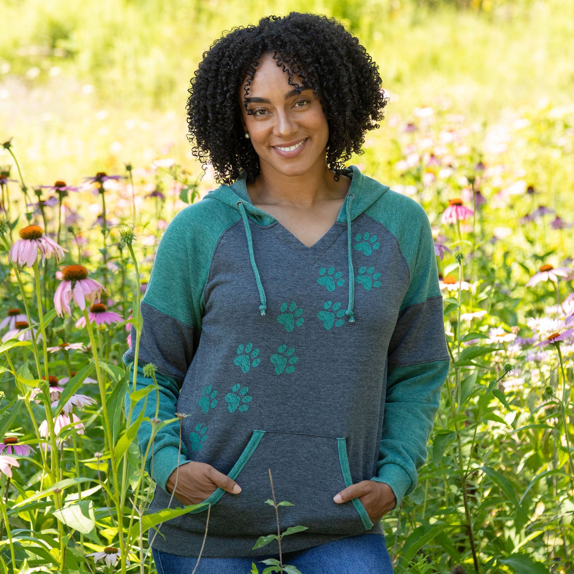 Super soft and incredibly ins-paw-rational, this cotton-blend v-neck hoodie is easily your new favorite piece of loungewear! Made with a burnout fabric design and perfect for everyday wear, it features sporty sleeve stripes and the unmistakeable symbol of animal rescue -- paw prints!