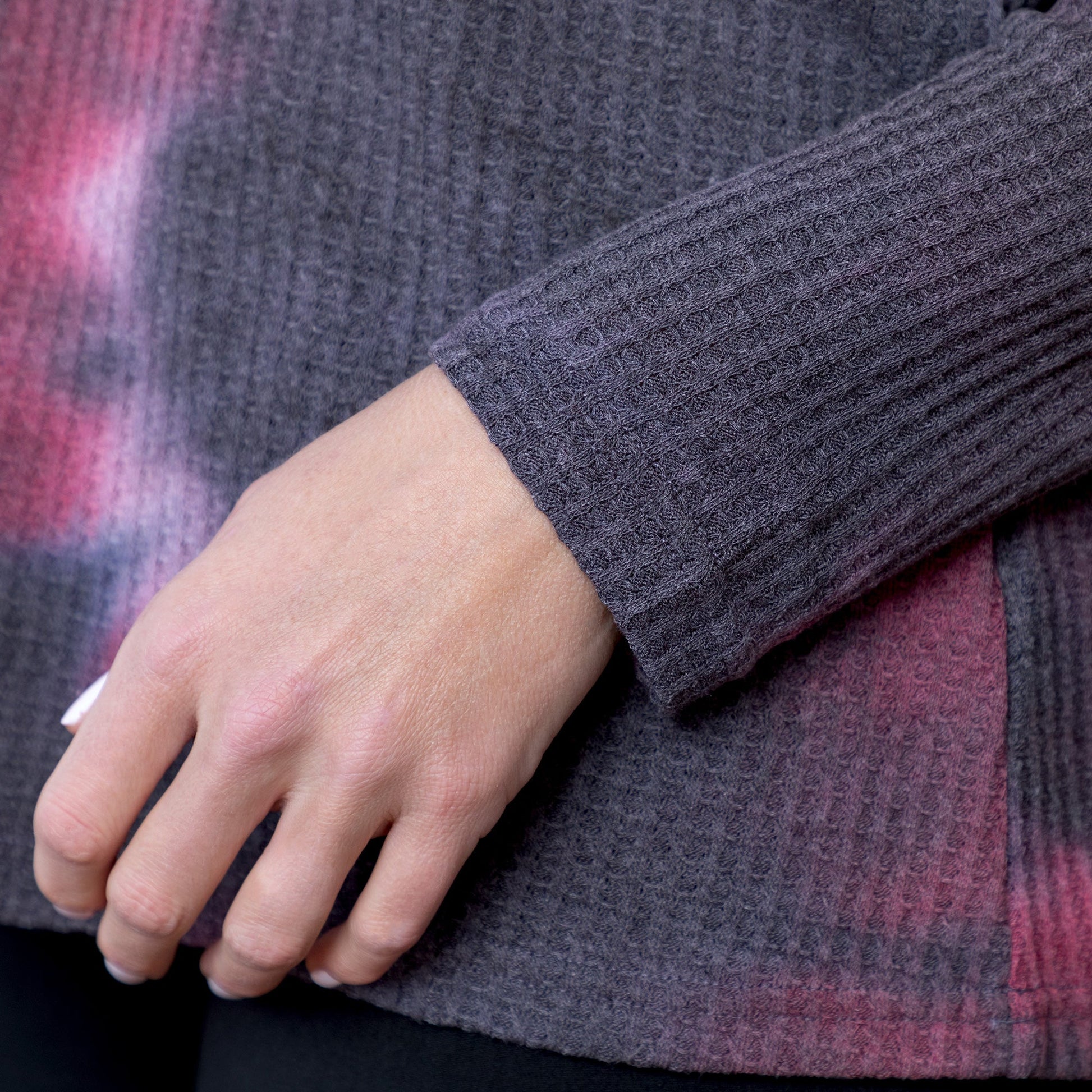 A cozy waffle weave is paired with a colorful maroon tie-dyed design on this stunning cold shoulder top! A mix of cute, comfortable, and casual, this long sleeve top brings a dramatic color with a one-of-a-kind tie-dyed fabric.