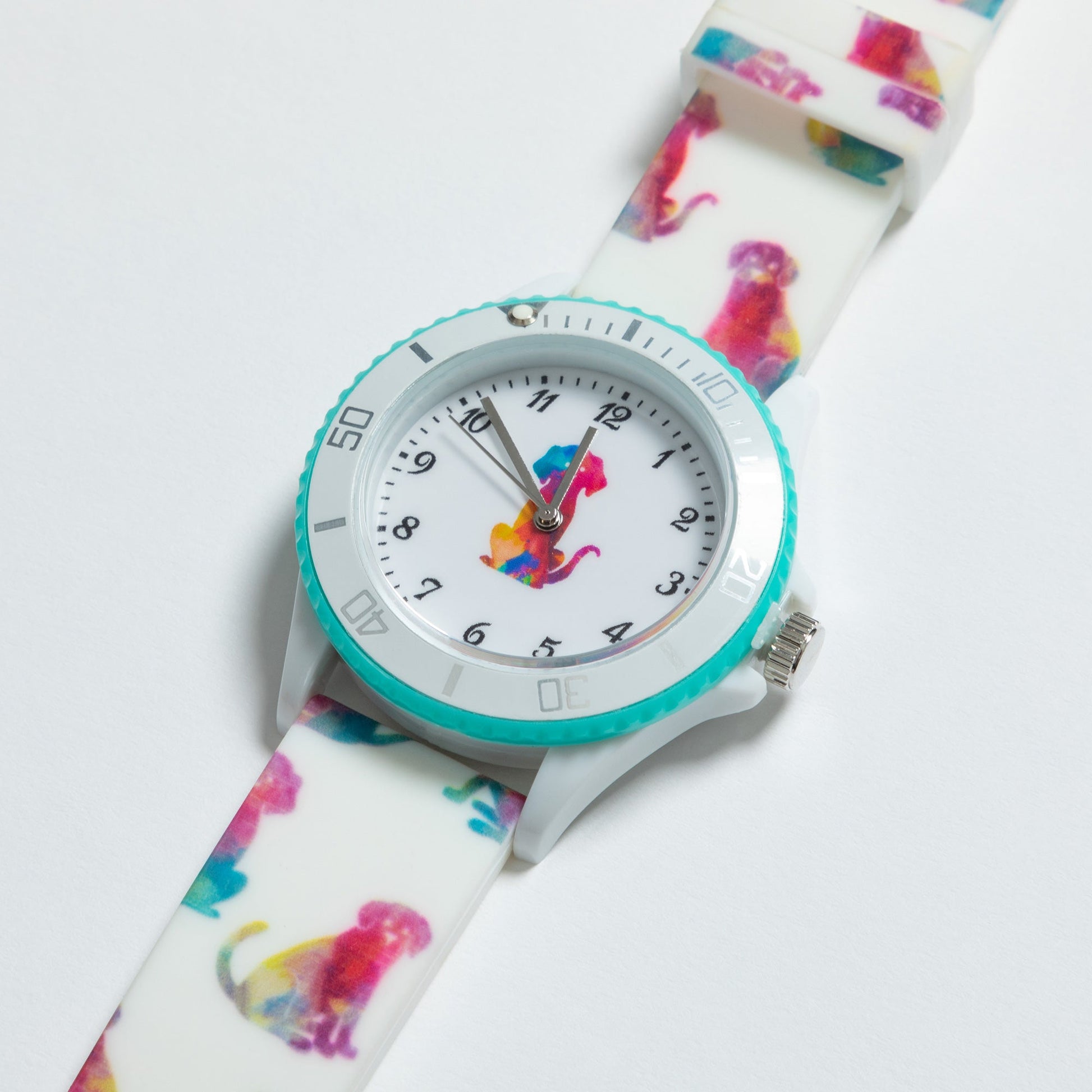 Oh would you look at the time! Time to give your sweet furry friend some love and attention. A soft silicone strap is patterned rainbow colored dog silhouettes, holding the quartz watch face in place, making sure you're never late for your best friend's favorite time of the day.