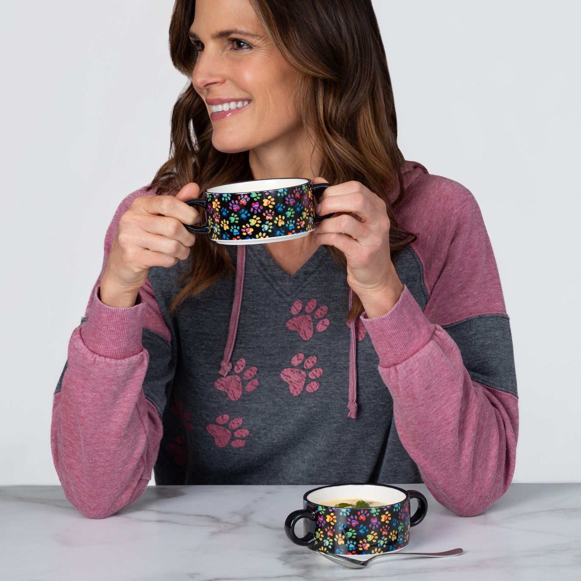 Patterned in paws that suit your style, this soup cup set is the perfect duo for your animal-loving home! With a cute design and comfortable double handles, it's perfect for enjoying your favorite soup or drink of your choice! With two mugs that stack on top of each other, they're a space saver while also being a beacon of your love for animal causes.
