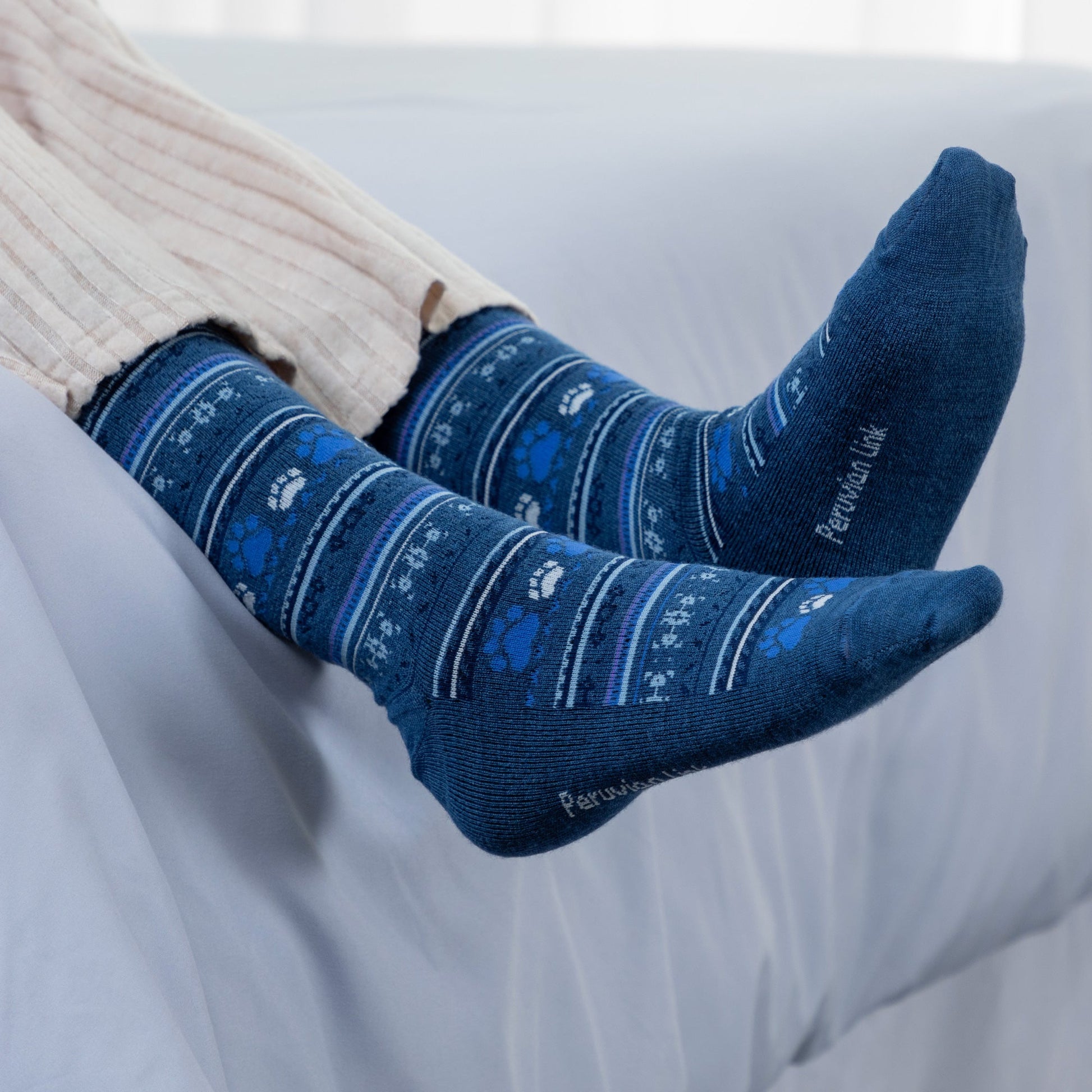 Bright colors are knitted in a striped pattern, spotted with paw prints in this incredibly soft and stretchy pair of socks. Woven with alpaca wool and aloe vera with jojoba oil for added softness. Plus, alpaca doesn't contain lanolin like sheep's wool, so it's hypoallergenic and doesn't have the common itchy wool feel!