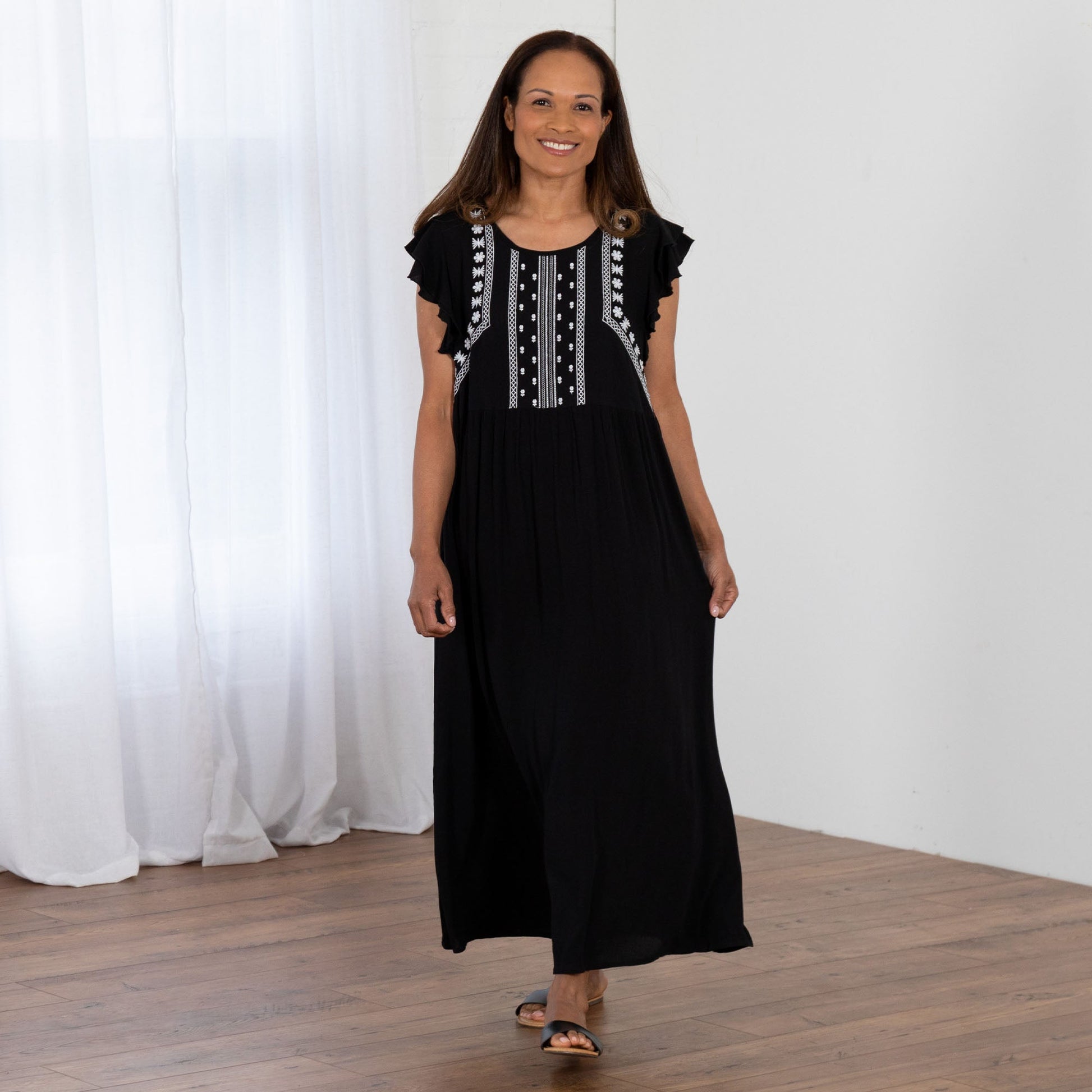 Flutter sleeves and gorgeous embroidery along the front yoke make this fair trade dress a brilliant blend of detail and minimalism. Made with a comfortable, relaxed fit and a keyhole closure in the back.