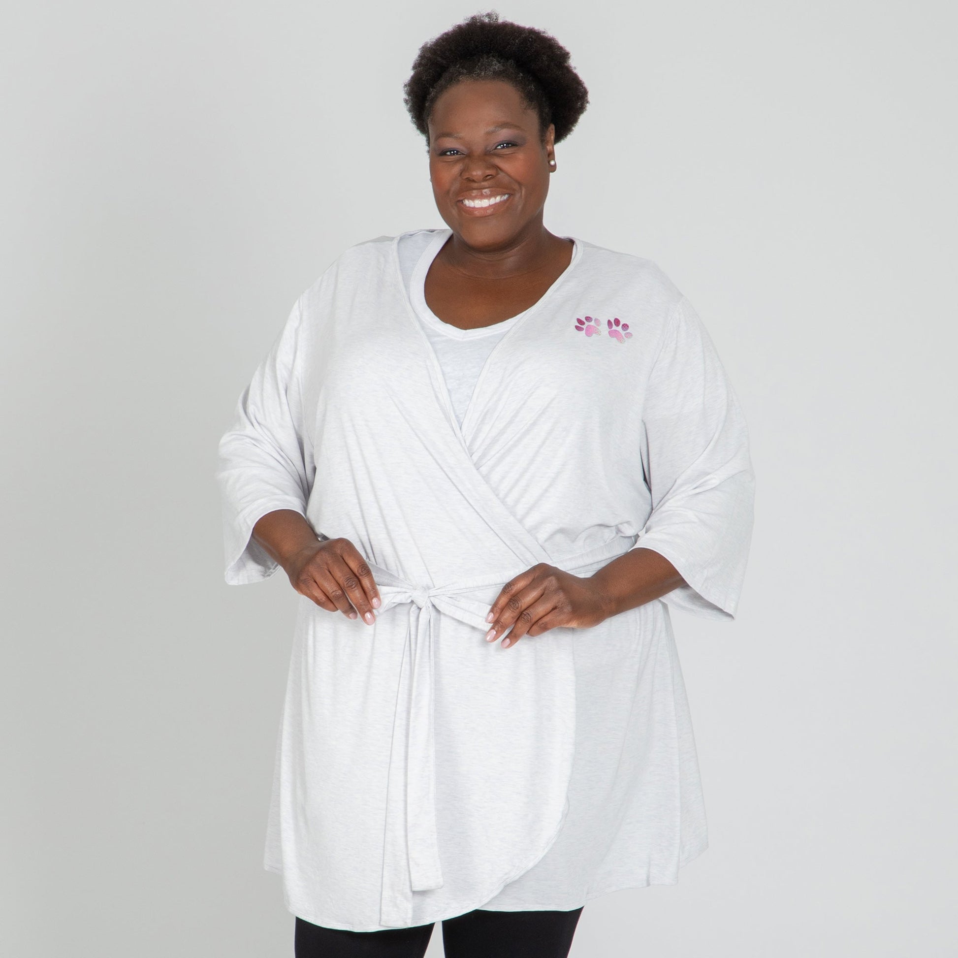 Your love for animals never fades. Wrap yourself up in this lightweight robe featuring two sweet paw prints. This fabric that has some stretch to it, is perfect for lounging about in. You'll be pawsitively relaxed in this soft bathrobe.