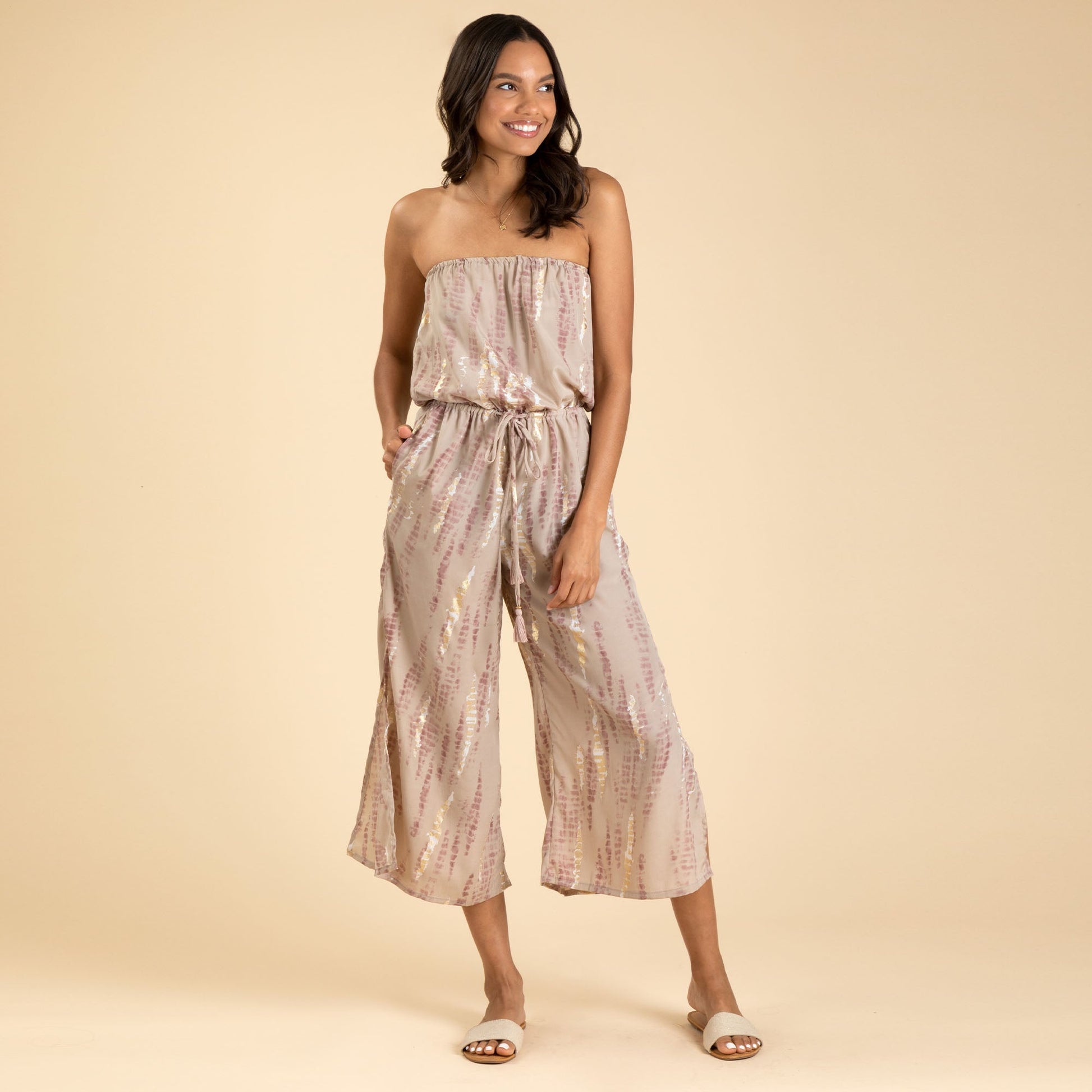 Rich colors in a gorgeous print inspired by recycled saree fabric, makes this strappless jumpsuit a bohemian dream! Complete with a soft fabric and flowy relaxed fit, with details throughout including the tassel ties at the front that help create the perfect silhouette.
