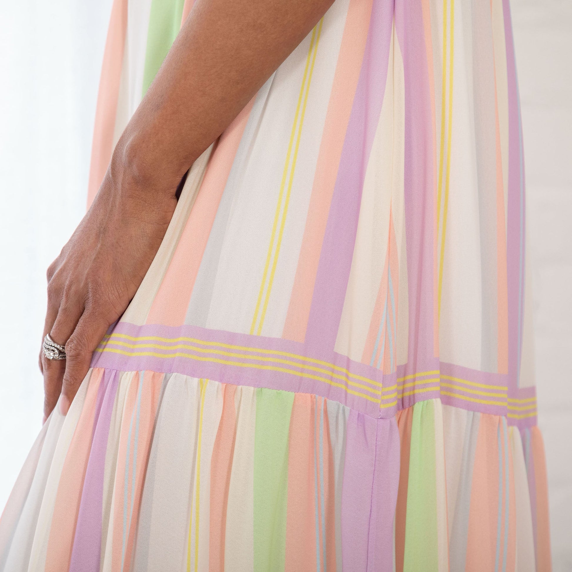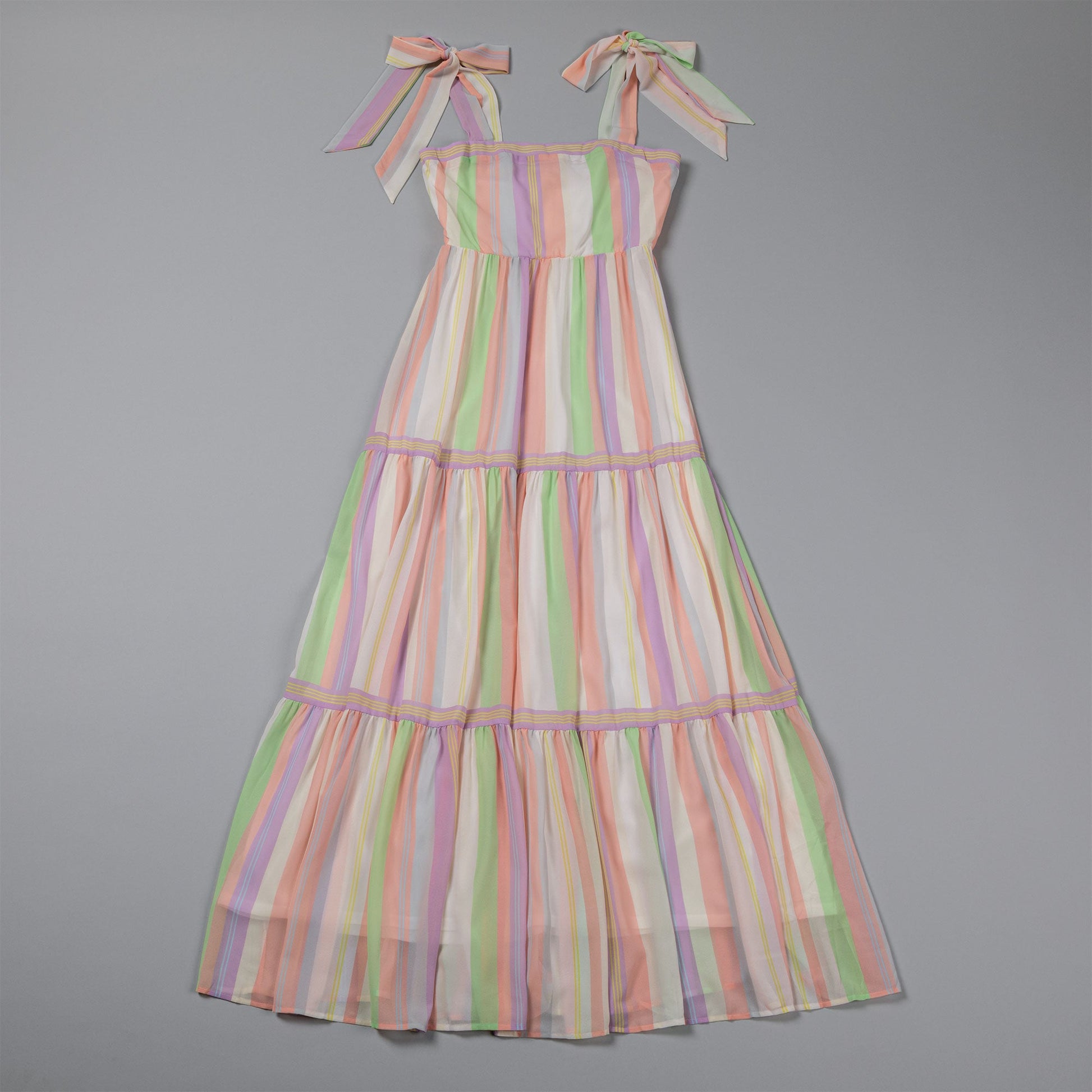 Colorful stripes pattern this tiered maxi dress, adding to the sweet, warm weather whimsy of your whole ensemble! Topped with shoulder ties that bring a feminine, vintage vibe.