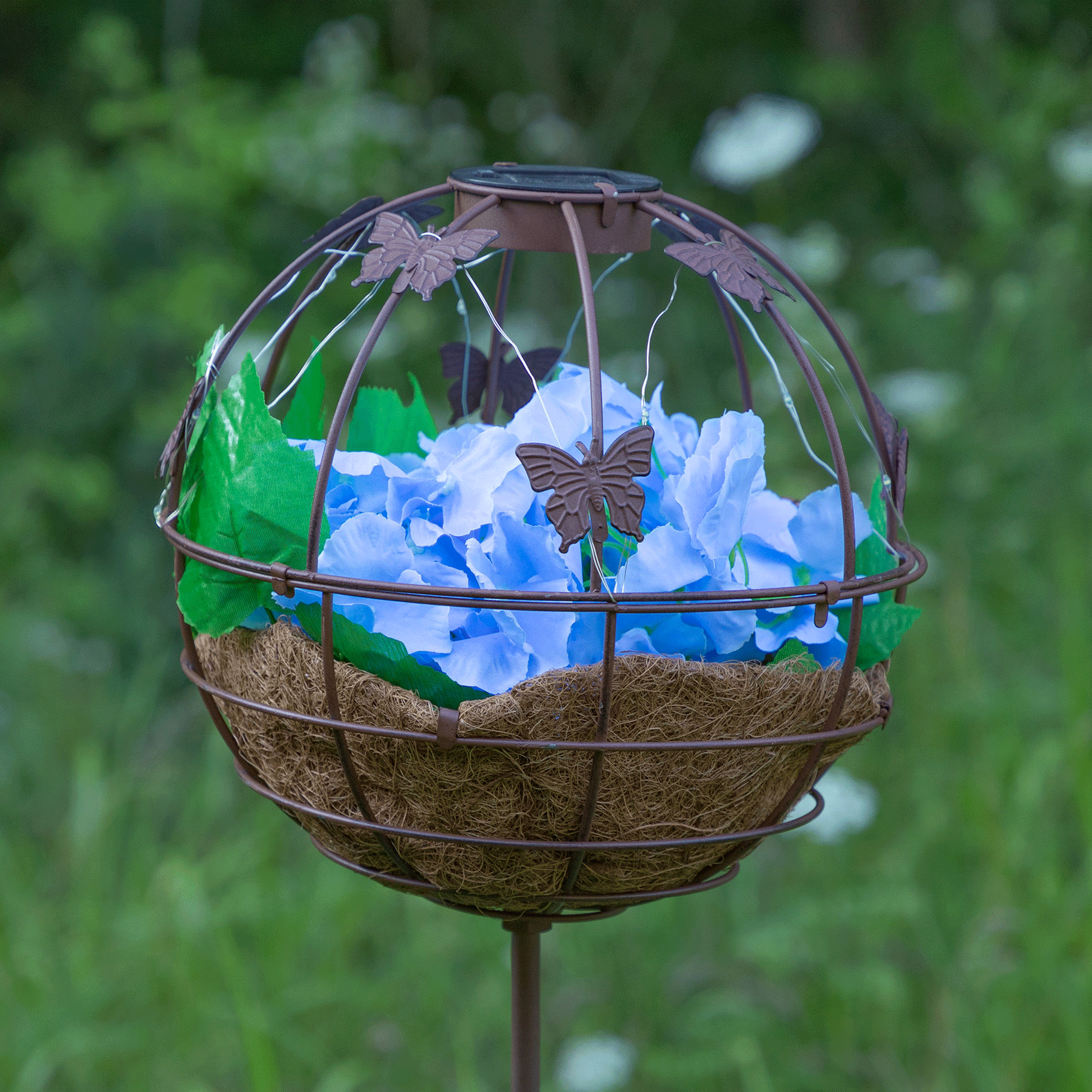 Turn your outdoor space into an ethereal place to relax! Easily stake this sphere planter into the ground with the solar panel in full sun to charge, and enjoy the butterflies or bees that flutter throughout the design! Topped with colorful faux flowers and greenery to enjoy during the day, and softly glowing LED lights that shine all night.